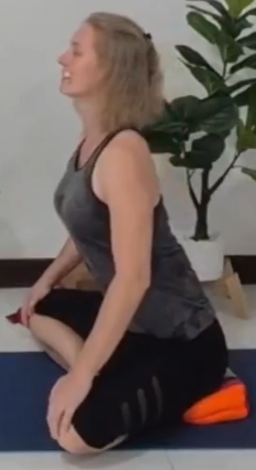 - Lege den Oberkörper rund darüber ab. Lege deine Stirn auf einen Block und stelle sicher, dass dein Gesäß so gut wie möglich auf den Fersen abgelegt ist.