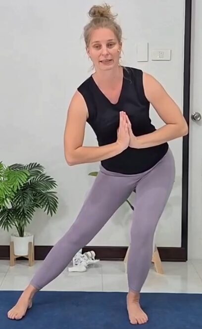 - Stelle deine Füße etwas mehr als mattenbreit entfernt voneinander auf (also etwas näher zusammen, als beim klassischen Skandasana). Die Zehen zeigen nach vorne.