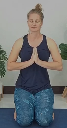 • Hände in Namaskāra (vor dem Brustbein) oder auf den seitlichen Rippen. Führe eine tiefe Zwerchfellatmung durch und beobachte die Erweiterung der Rippen während der Einatmung.