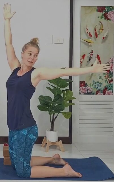 Diese Übung fördert die Rotationsfähigkeit und Beweglichkeit der Schulterblätter über einen beweglichen Brustkorb und bereitet die Achsel-/Seitregion vor für laterale Länge ohne Zug am Lendenbereich.