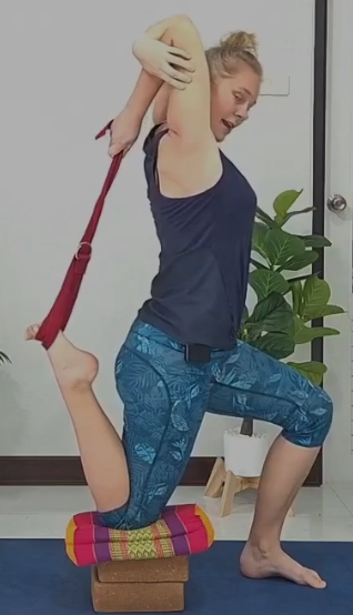Nimm dir einen Gurt und bringe den hinteren Fuß in den Gurt. Halte den Gurt mit der Hand auf der gleichen Seite und bringe deinen Ellenbogen in Richtung Decke, sodass deine Hand den Gurt hinter deiner Schulter hält. Du solltest nun eine Dehnung in deiner gesamten Vorderseite spüren. Greife dann mit der anderen Hand deinen Ellenbogen, um die Position weiter zu vertiefen.
