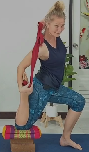 • Staple zwei Blöcke übereinander und lege ggf. ein Kissen oder ein Polster darauf, wenn du druckempfindliche Knie hast – durch die erhöhte Unterstützung in dieser Variation lassen sich Bindungen sicherer herstellen; das Becken bleibt besser zentriert.