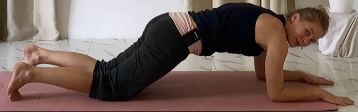 • Drücke die Unterarme aktiv in den Boden. Beginne, vom oberen Teil der Wirbelsäule in eine Rundung zu gehen (optional: hebe kurz die Beine an, bis du in einer Plank bist).